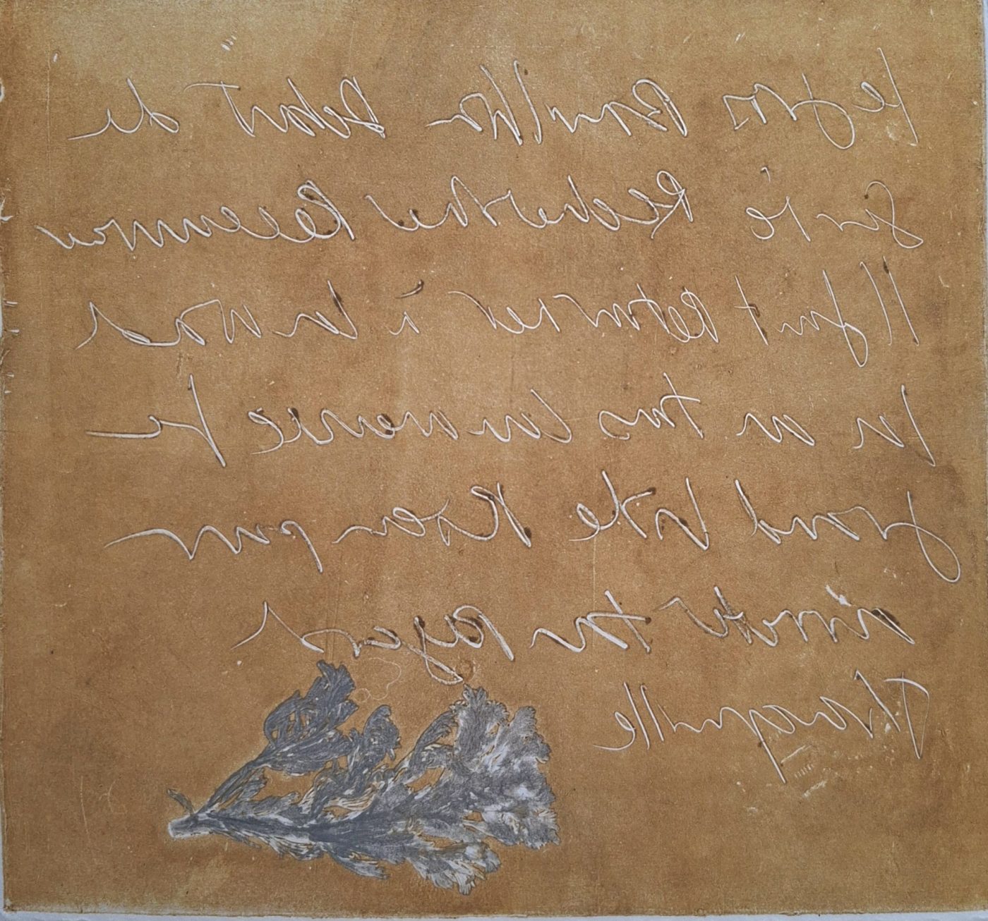 Seawood ( zeealsem) has the most wonderful smell, each time i walk on the salt marshed I rub some between my fingers and bring it home. Lead plate rolled in with ochre ink, text written in the ink and grey alsem inkted and placed upon.