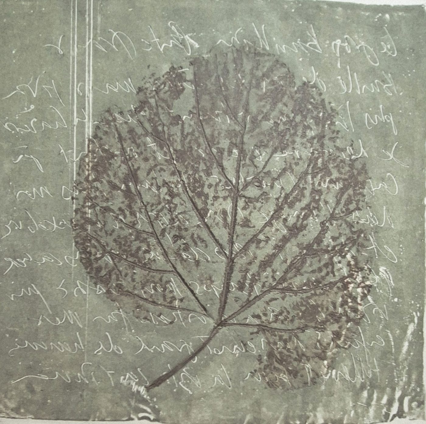 Large Lime Tree Leaf wethered down inked in brown and placed upon grey green inked lead plate. Text written in the ink. Each time new lines spring to mind.