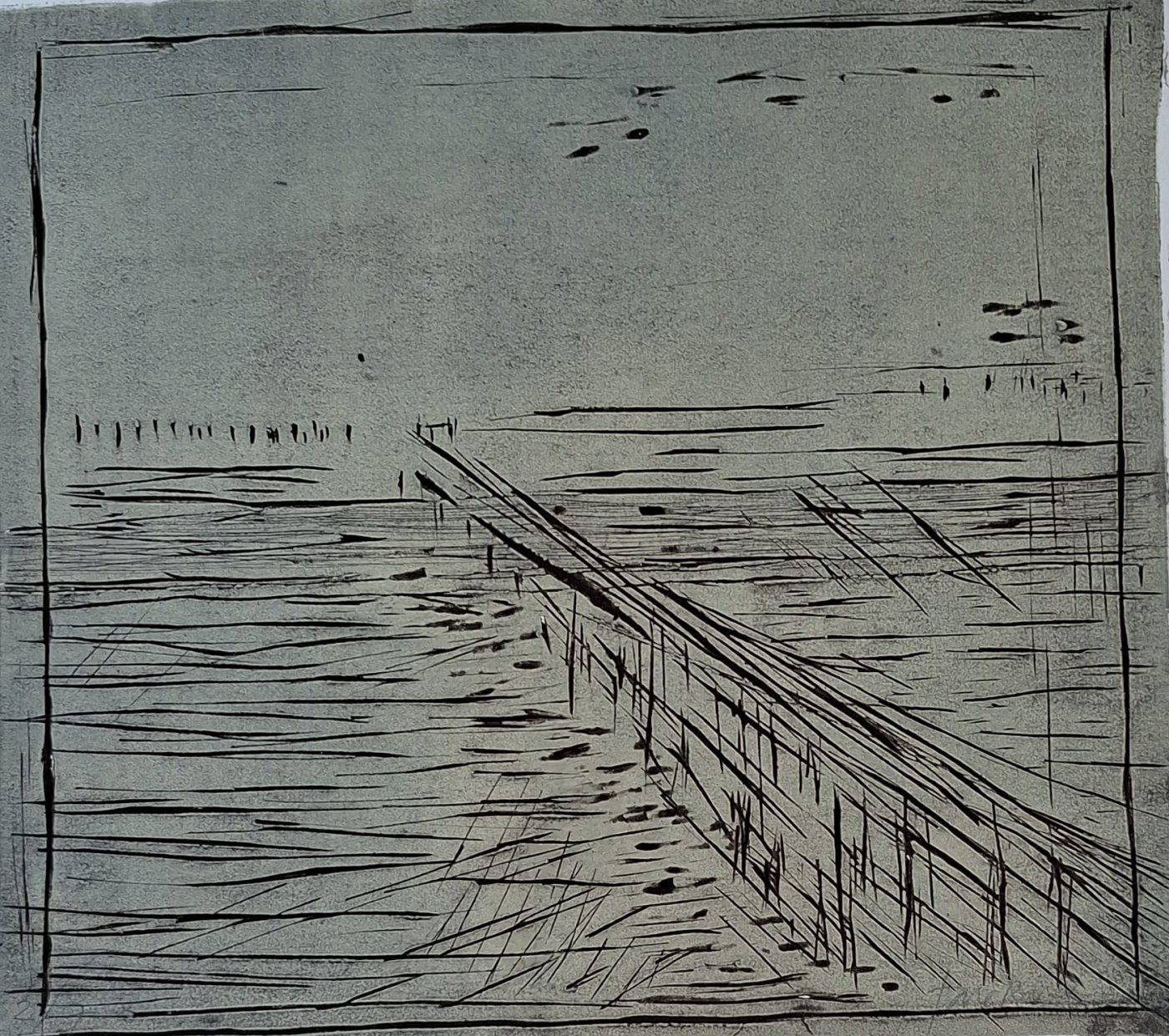 Experiment of using drypoint linoleum. I filled the lines with warm brown ink, wiped the surface clean and rolled a transparent grey ink on the surface, like you would do for relief print. Two colored print from a single matrix.