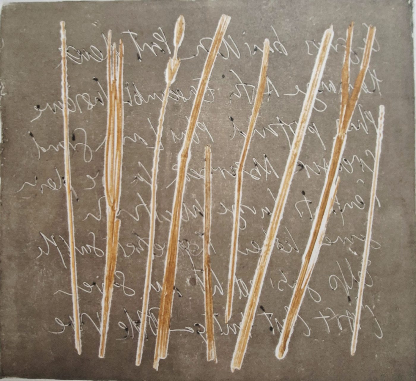 Seagrass in ocre ink placed upon a lead plate rolled in a wet clay color. Text written in the ink.